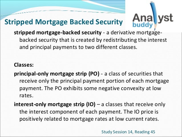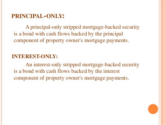 In general, stripped mortgage-backed securities represent a mortgage pool’s Interest-only (IO) and Principal-only (PO) cash flow components. Investors in the IO class usually receive 100 percent of the interest payments, ... Doc Retrieval