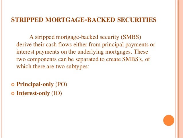 Introduction to Mortgage-Backed Securities Stripped Mortgage-Backed Securities (SMBSs) † The principal and interest are divided between the principal-only (PO) strip and the interest-only (IO) strip. ... Read Document